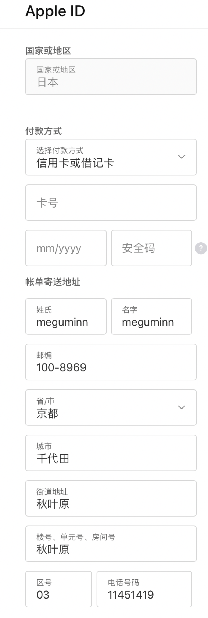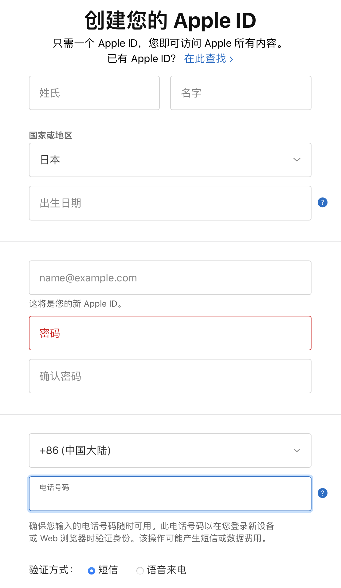 需要注意的是地区填"日本"就好, 其他都和正常注册一样, 电话号码可以用国内的电话号码.